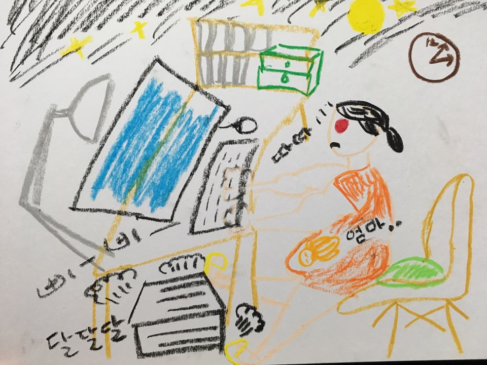 남편이 그린 그림 중 웃긴 그림입니다. 제가 막달 되면서 회사 육아휴직 내고 집에서 쉬면서 프리랜서 디자이너로 지인이나, 삼촌이 일 부탁하면 가끔 도와주고는 했었거든요. 그때 모습을 표현한 그림이에요. 새벽 2시인데도 눈 빨개진 채로 일하는 저의 모습, 남편이 정말 정말 싫어했었죠. 컴퓨터 데스크톱 소리는 왜 이렇게 크게 나며, 키보드 소리는 따닥 따닥. 다리가 짧아서 의자 끝에 앉아서 일하는 디테일한 모습까지 똑같이 그렸습니다.