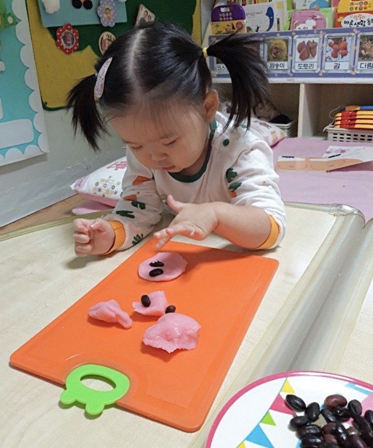 왼손으로 붙이기를 하고 있는 모습 오른손 사용의 뇌 발달을 풍부하게 하지 못해 어색해합니다.